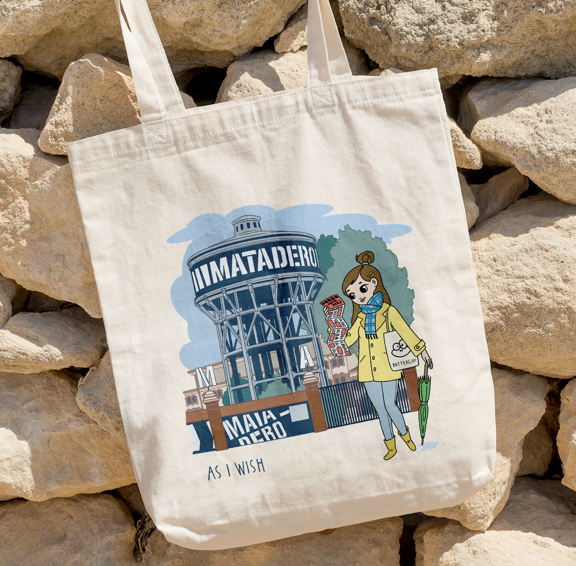 Adornada con una encantadora ilustración de nuestra Buttercup junto a Matadero Madrid. Perfecta para llevar tus esenciales con estilo y un toque artístico, esta bolsa combina funcionalidad y diseño único.